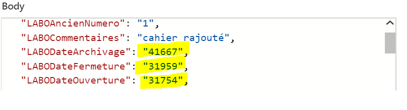 En effet, dans l’illustration ci-dessus, le champs “LABODateOuverture” est réellement 08/12/1986 qui devient 31754.