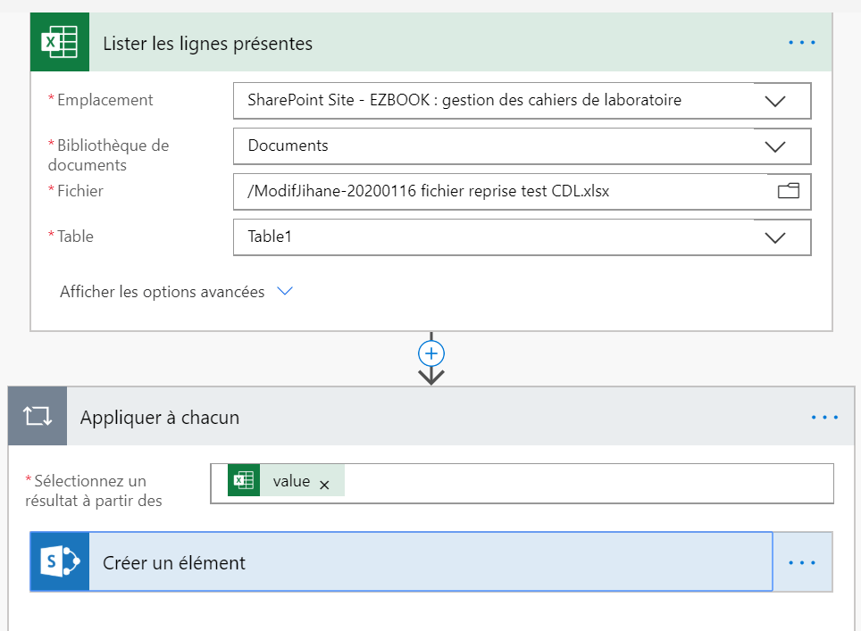 L’importation des données de Excel vers SharePoint est très simple maintenant grâce aux flux dans Power Automate. On commence par récupérer les lignes présentes dans une table donnée du fichier Excel. Puis, pour chaque ligne, on créé un élément dans la liste SharePoint en spécifiant le mapping entre les colonnes.