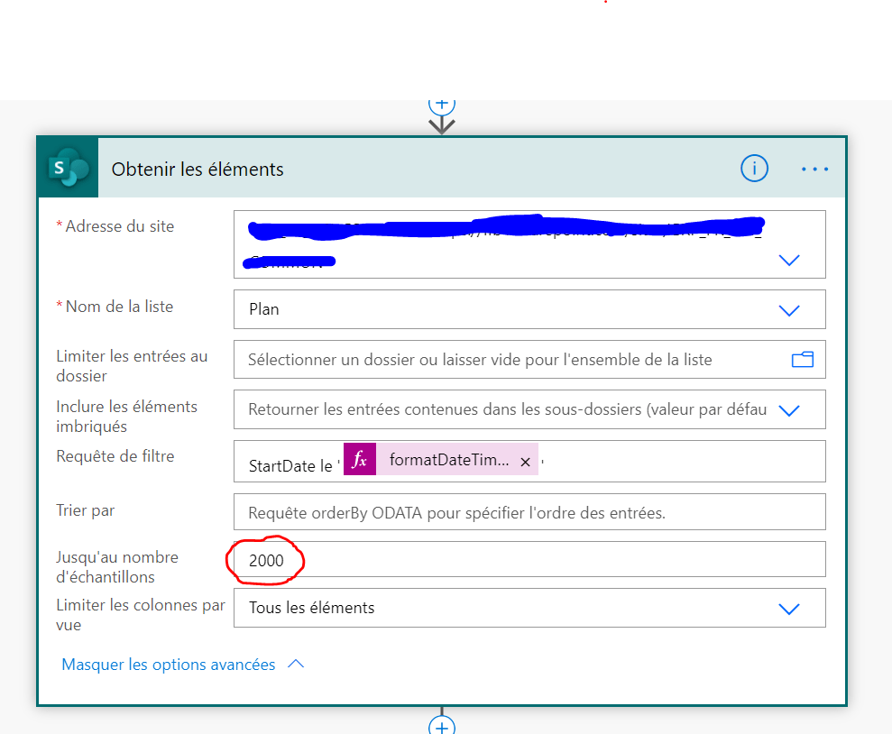 Dans l’étapes obtenir des éléments de SharePoint, il faut changer le nombre des échantillons sinon ça va être 100 éléments seulement par défaut :